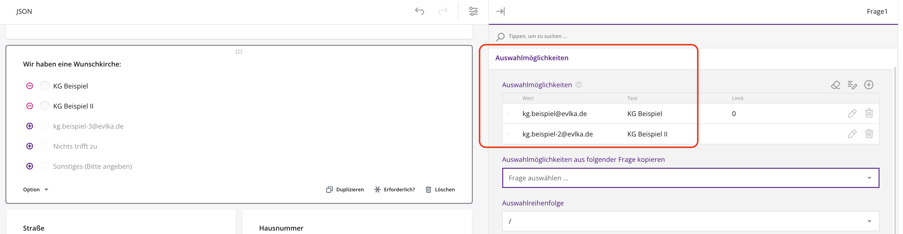 Eingetragen werden die Mailadressen in den Eigenschaften des Auswahlfeldes unter "Auswahlmöglichkeiten" als Wert.