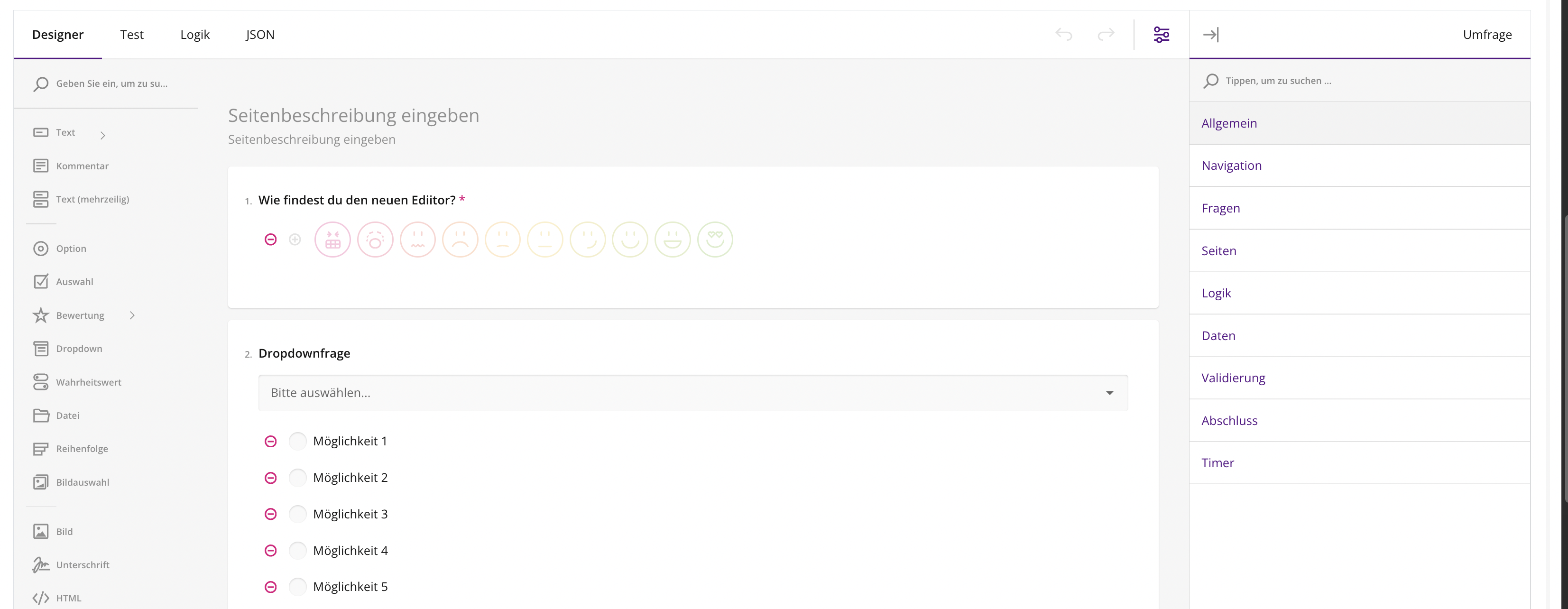 Die größte Änderung: Sie finden nun die Auswahl der einzufügenden Felder im Menü links und die jewiligen Feldeigenschaften auf der rechten Seite.