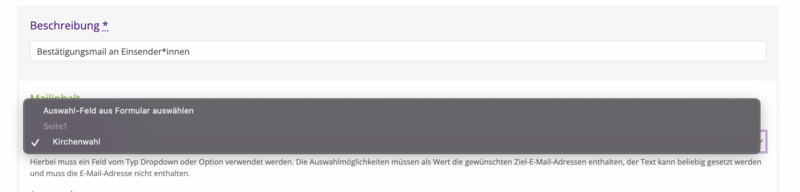 Im fertigen Formular gibt es nach dieser Anpassung die Möglichkeit ein Element auszuwählen, was dann eine Benachrichtigungsmail an eine vorher eingetragene Mailadresse auslöst.