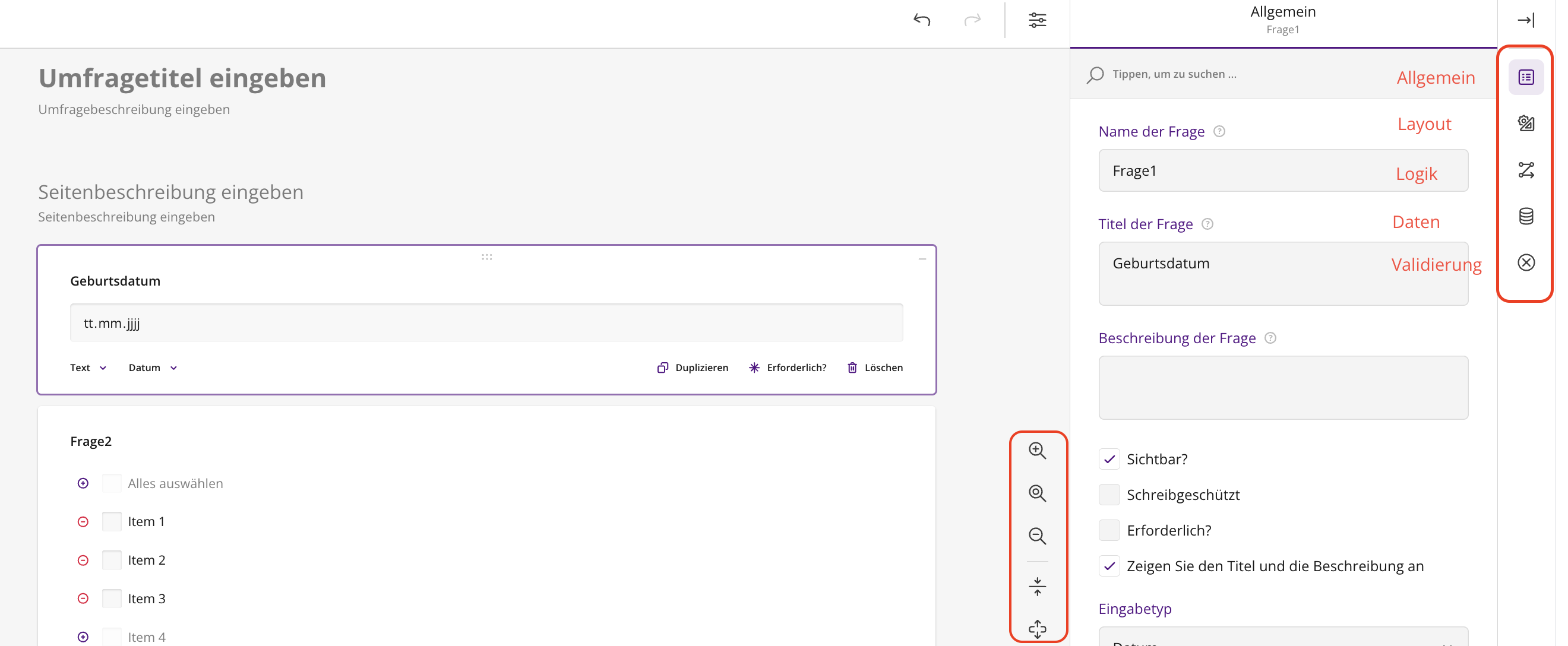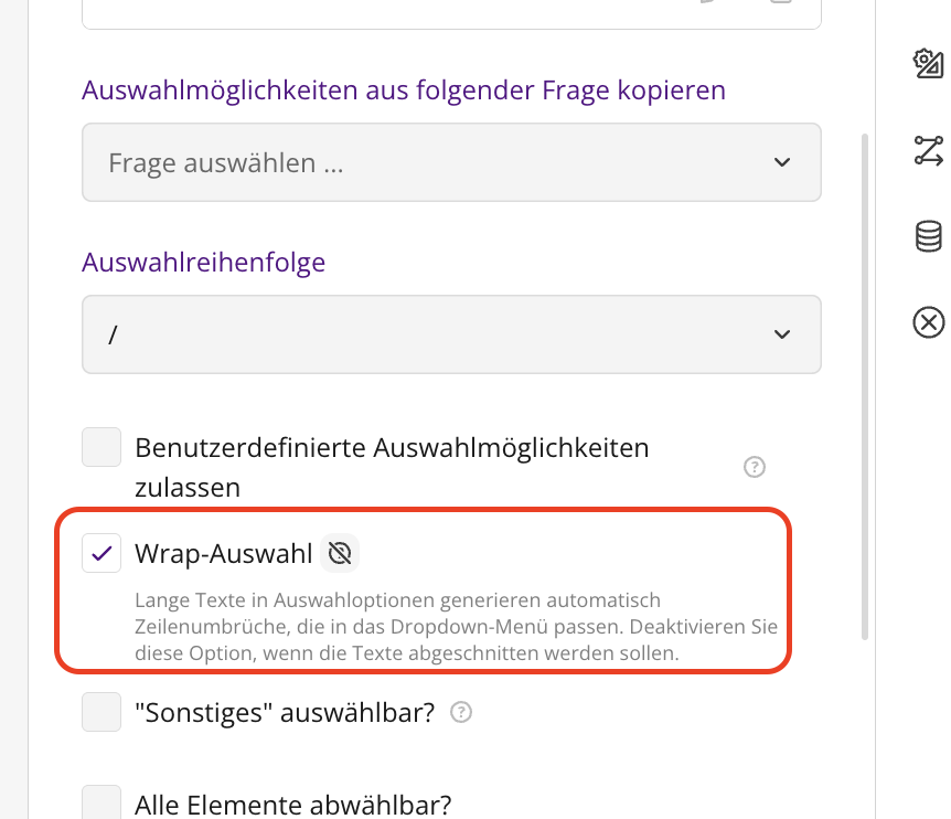 Im Zuge eines Versionsupdates der Software von SurveyJS wurde neben einer Problembehebung und Performanceverbesserung die Menüleiste für die Formular- und Feldeinstellungen optisch etwas umstrukturiert.